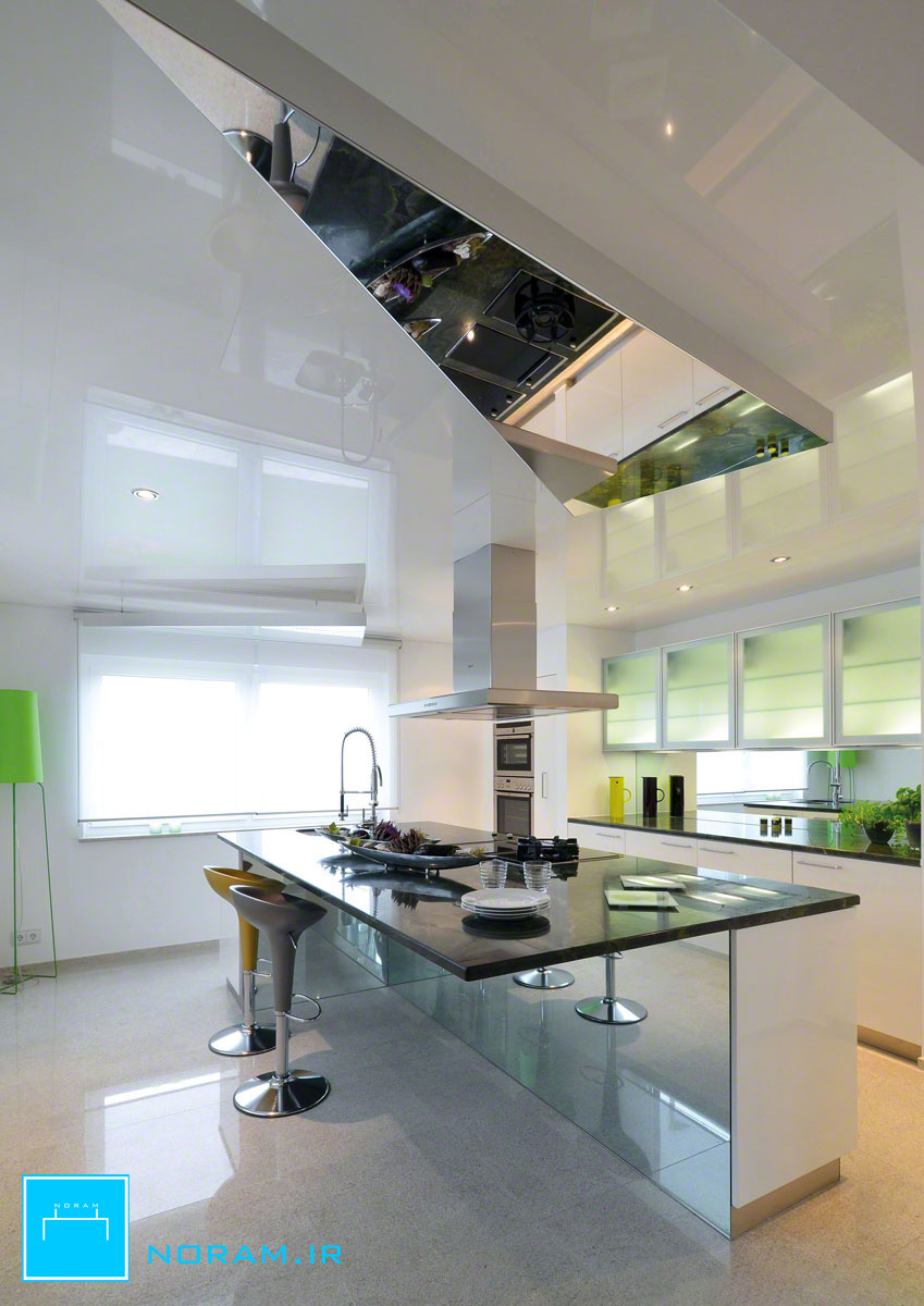 سقف های آیینه ای آشپزخانه شمارا خیلی دلباز تر میکند. این سقف ها با بازتاب آشپزخانه شما در خود، درخشندگی را به محیط پخت و پز شما میدهند. این سقف ها در بیست رنگ مختلف تولید میشوند. در سقف های آیینه ای میتوانید انواع نورپردازی هارا کار کنید.