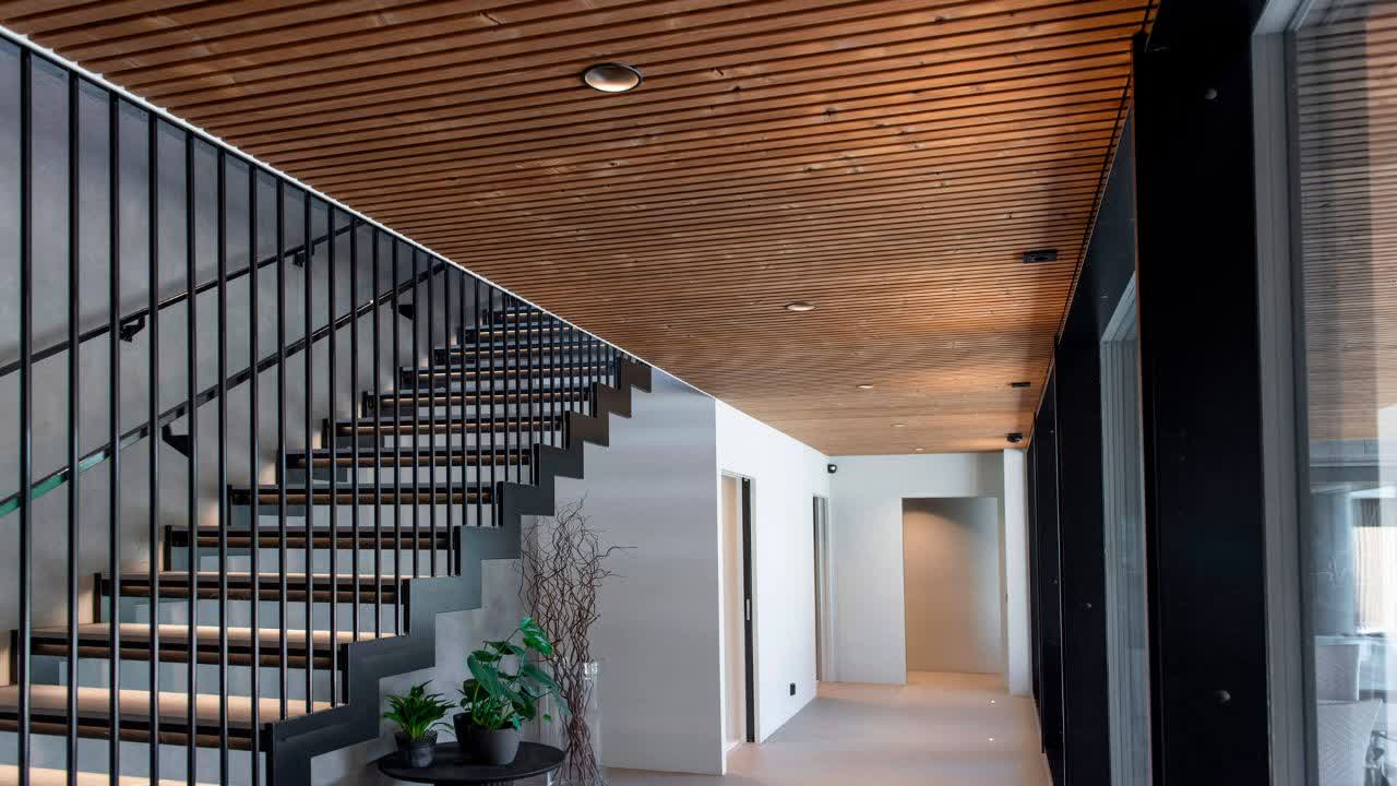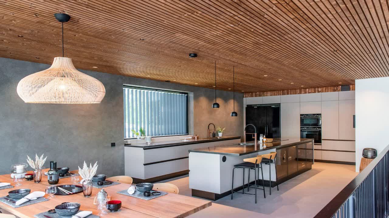 سقف ترموود یکی از گزینههای مدرن در زمینه معماری و دکوراسیون است. این نوع سقف از چوب گرانولهشده با فشار و حرارت بالا به دست میآید که خواص مقاومتی بالا و ظاهر زیبایی دارد. طراحی سقف ترموود ممکن است الهام گرفته از طبیعت باشد و از جنبههای زیبایی و گرمای چوب در داخل فضا استفاده کند. خطوط ساده، سطوح صاف، و ایجاد انحناها یا شکلهای هندسی مختلف از جزئیات مدرن در طراحی ترموود به شمار میروند. همچنین، این نوع سقف به دلیل خواص عایق حرارتی و صوتی خود، میتواند به بهبود کیفیت محیط زندگی کمک کند، که از نظر عملکردی نیز در زمینه ساختمانهای مدرن اهمیت دارد. این سقف ها همچنین با ترکیب چراغ های خطی فوق العاده جذاب میشوند.