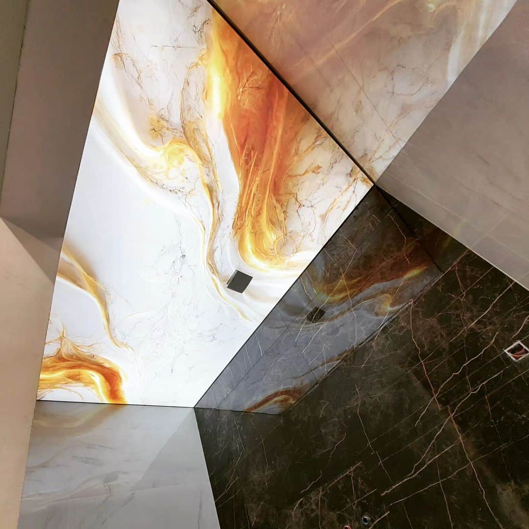 سقف یا دیوار محیط داخلی یا خارجی خود را سنگ کنید!  کیفیت چاپ تصاویر بر روی پارچه های کشسان به قدری خوب است که تشخیص این صفحه های سنگی از سنگ واقعی با لمس کردن ممکن است. میتوانید با حداقل قیمت و بدون زیر سازی، سقف خود را سنگ کنید. این سقف علاوه بر اینکه سنگین نیست، میتواند آوار ریخته شده سقف اصلی را در هنگام زلزله در خود نگه دارد و حافظ جان شما باشد. سقفی شبیه به سنگ که حداقل 20 سال ماندگاری دارد و به راحتی شسته میشود. این سقف را میتوانید با نصب انواع دوربین، اسپرینکلر، دیتکتور، هالوژن و… اجرا کنید.