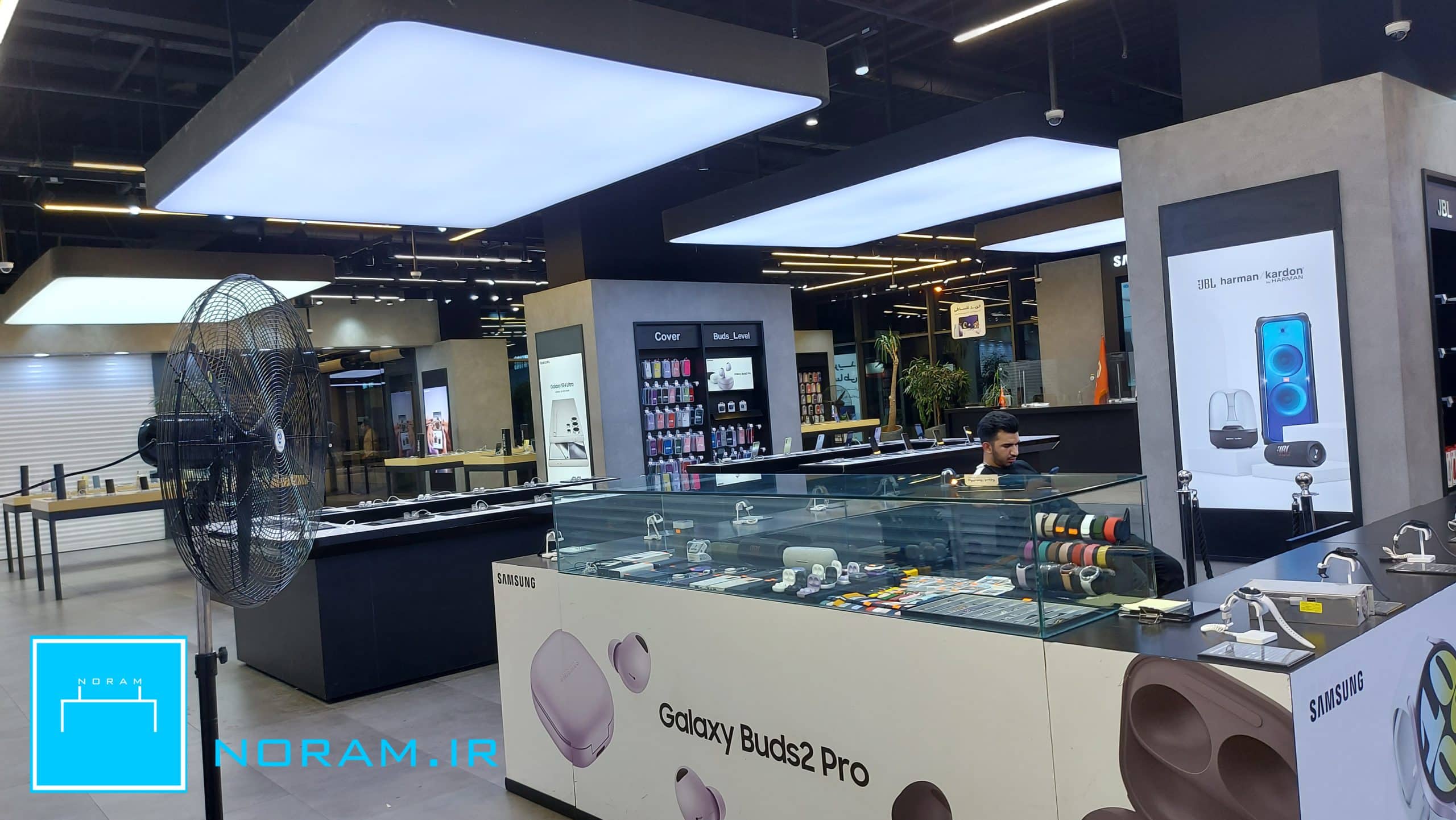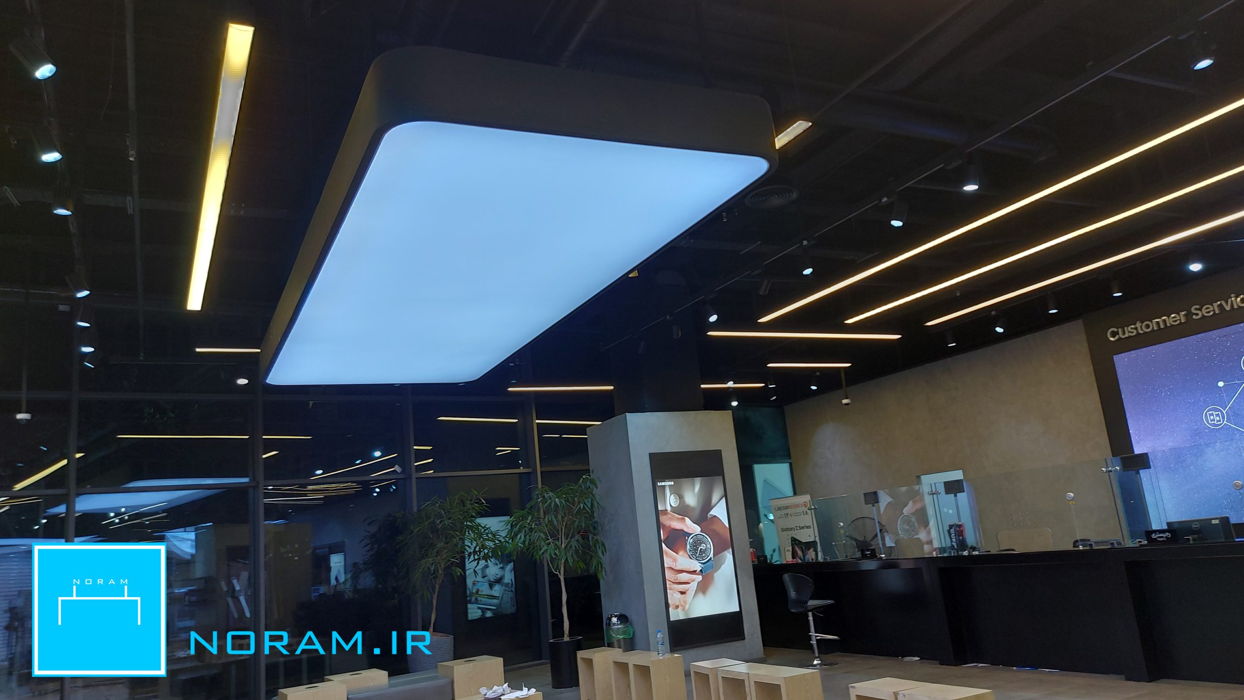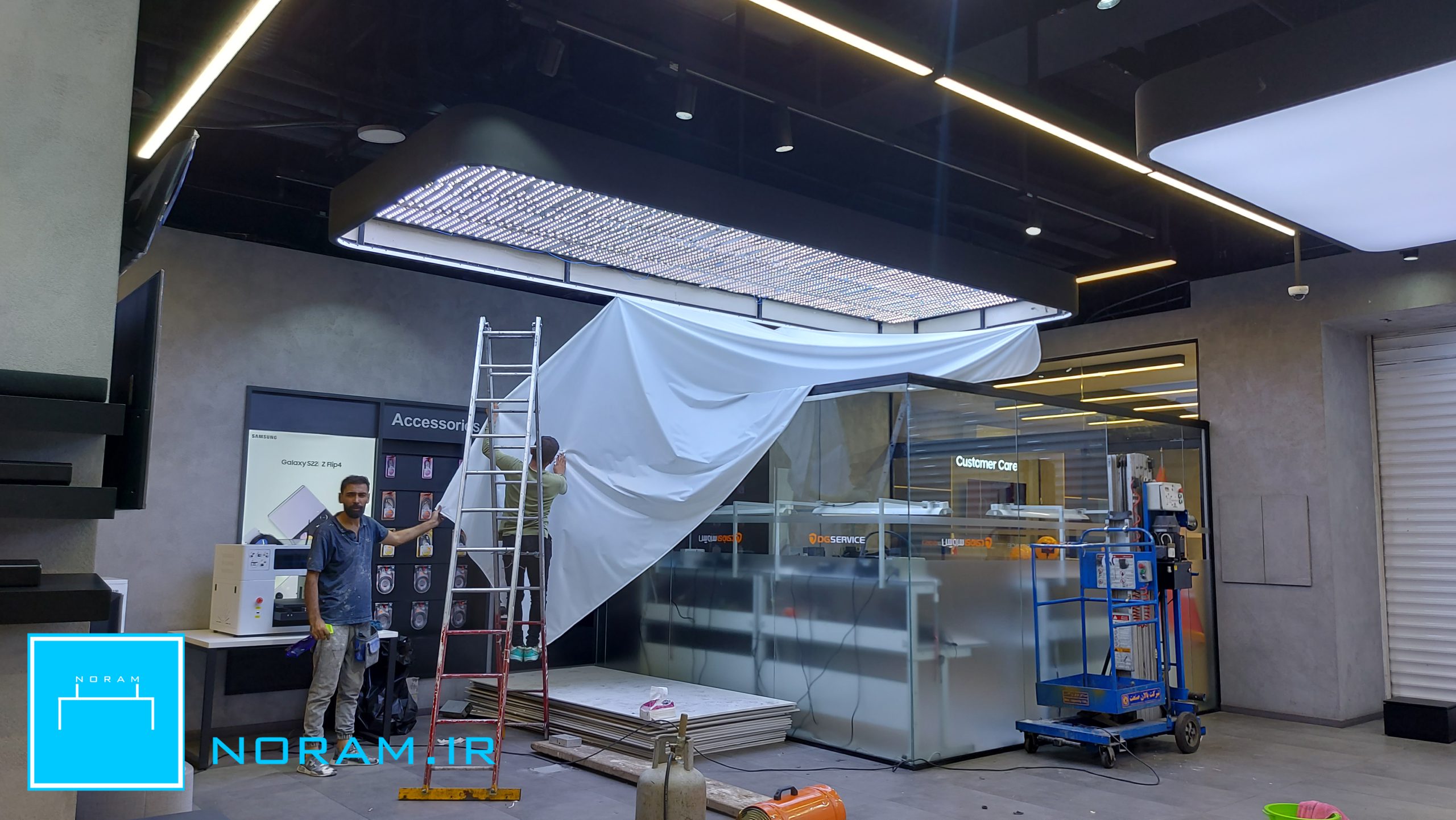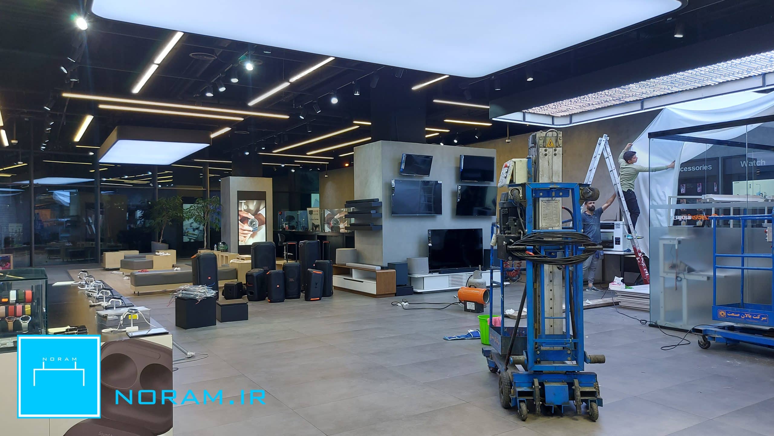 اجرای نورپردازی و سقف کشسان پروژه نمایندگی لوکانو در ایران مال، تهران
